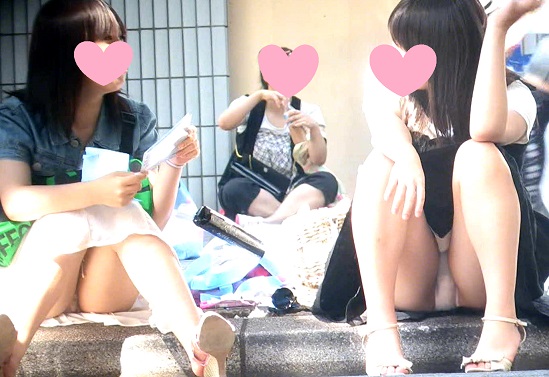 2人目の子はイベントに出演するお化粧のチェックをしている女の子です。しっかり足を閉じているつもりでも、ピンクの水玉パンティをズームで見ちゃいます。